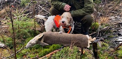 Kleo har trent mye spor og er en godkjent etterøkshund og spore opp dette rådyret måtte han også.Men han har hatt loser på over timen så han er godt igang.